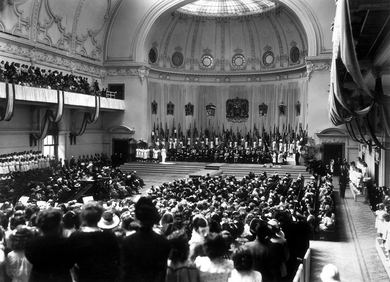 De Stadsfeestzaal draagt meer dan een eeuw geschiedenis in haar marmer en staal – een verhaal van ambitie, verwoesting en een glorieuze comeback.